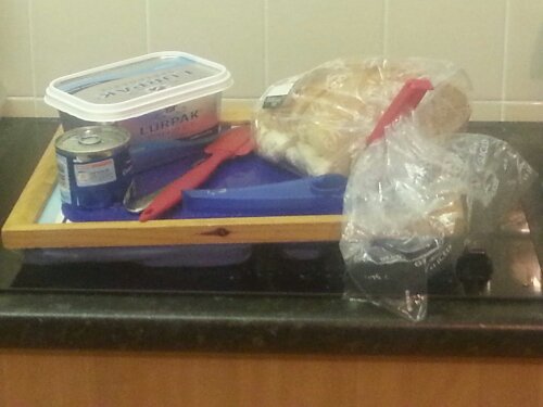Ignoring the pan for now, I grabbed my beanbag tray, with handy dycem, slapped the plate on it, and balanced in precariously on my knee tipping it towards the floor as I did so. Tearing at chunks of toast with an adapted fork while steadying it with a sharp knife I eventually managed to eat my lunch, smearing it over the tray, my face, and my lap in the process. Eating done, I repeated the dish doing, lap soaking process and drove straight for the lukewarm coffee I made at the beginning of the process, slugging it down gratefully.